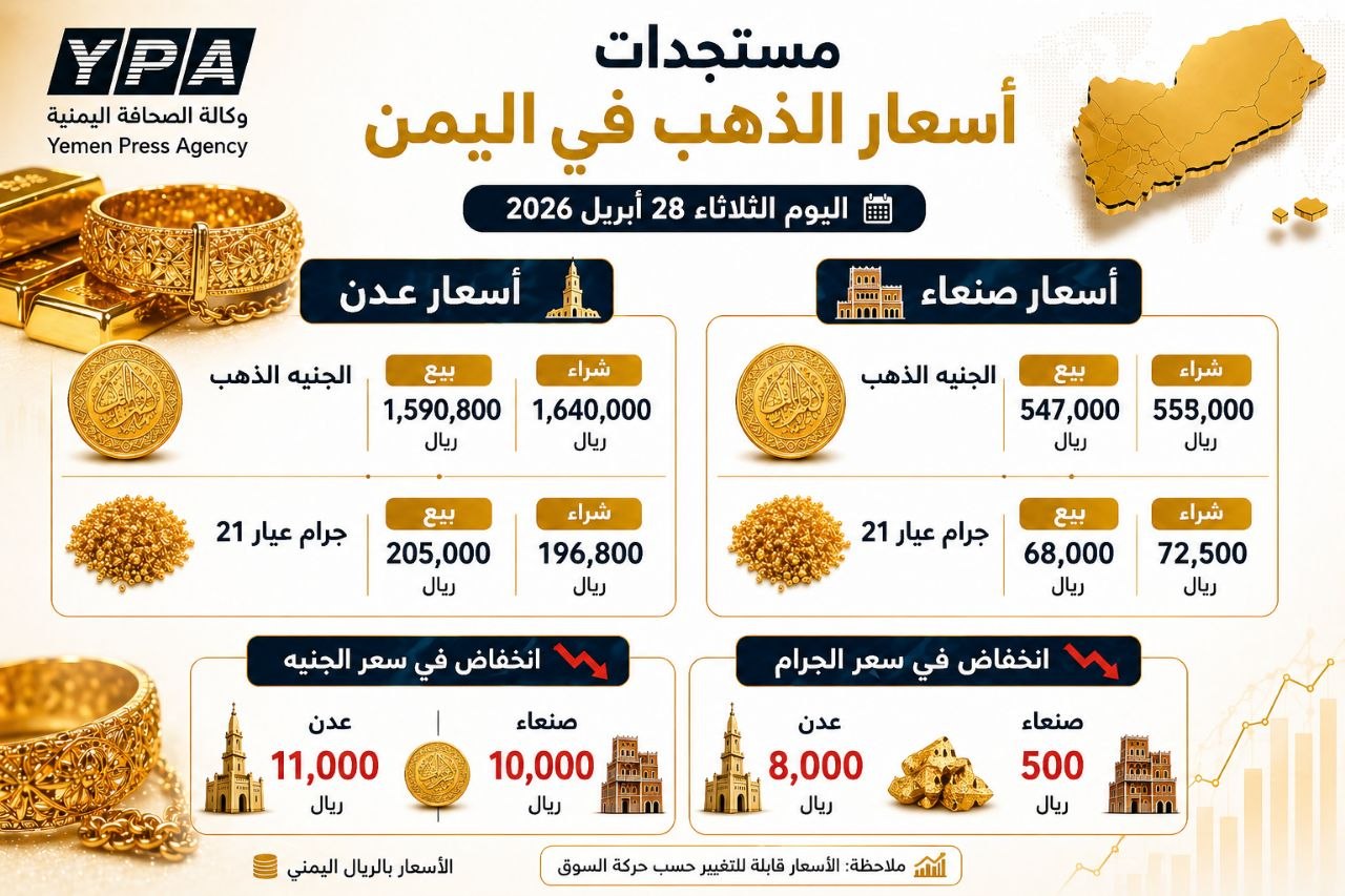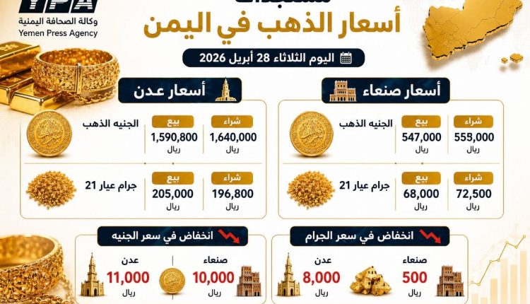 وفيما يلي قائمة بمتوسط أسعار الذهب بأسواق اليمن، الثلاثاء 28 أبريل 2026م