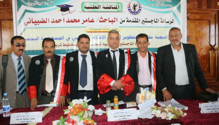 حصل الباحث في الإعلام الجامعي “عامر محمد الضبياني” اليوم على درجة الماجستير بتقدير امتياز والدرجة النهائية في الإدارة والتخطيط التربوي من جامعة ذمار، وذلك عن بحثه الموسوم بـ”إستراتيجية مقترحة لتطوير إدارات الإعلام الجامعي في الجمهورية اليمنية”
